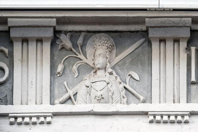 Ce retour à l’Antiquité s’exprime aussi dans le décor en pierre de l’édifice. De grandes
