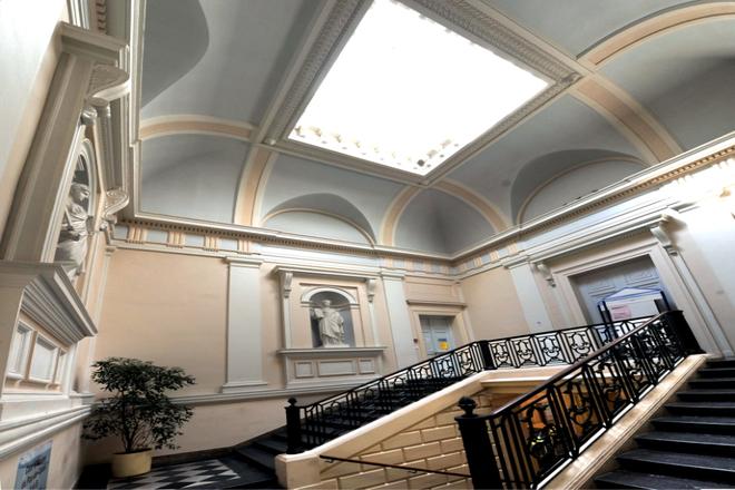 Au sommet de l'escalier, l’espace est largement éclairé par une verrière. L’aménagement dans le pur style néoclassique (XIXe siècle) est d’une sobriété majestueuse : voûte avec caissons à fleurs, colonnes monumentales,… Deux allégories, du sculpteur audomarois Louis Noël, représentent la Loi et la Justice.