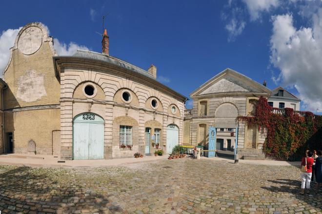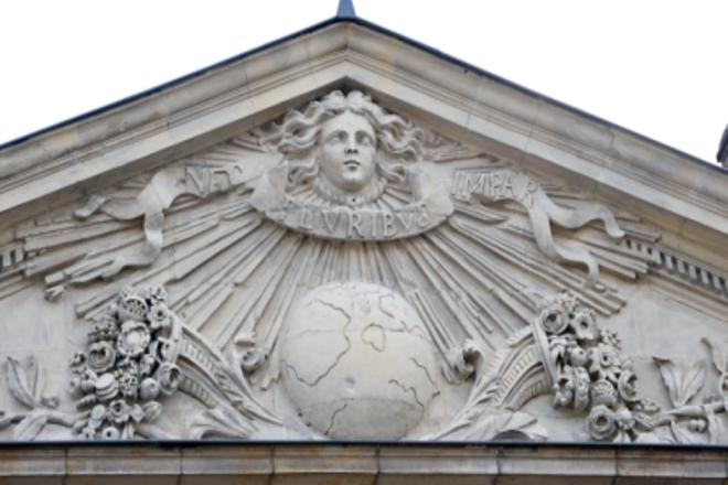La façade, aussi sobre soit-elle, est monumentale : il s’agit bien d’un palais, qui doit exprimer la puissance de l’Eglise. C’est aussi un édifice à la gloire du roi, comme en atteste le fronton. Le roi soleil, qui guide et réchauffe son peuple, surplombe le globe terrestre et des cornes d’abondance. La devise est conquérante : « nec pluribus impar », « je suffirai à tout ».